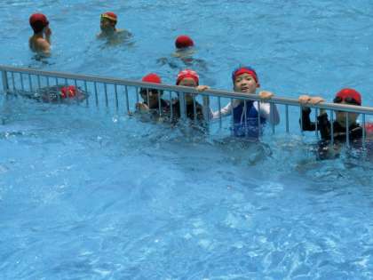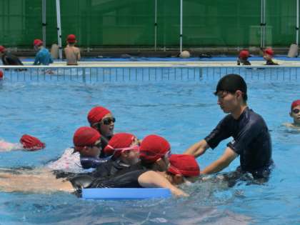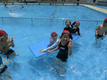暑い日の水泳活動は、子供たちにとって楽しい時間です。泳力に応じて3つのクラスに分かれて、個々が自分の課題達成のためにがんばっています。多くの子が自分の記録を大きく伸ばしています。