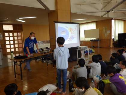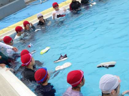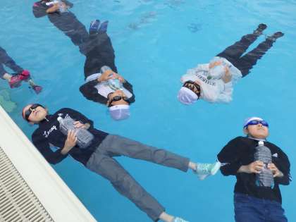 5・6時間目に、一般社団法人水難学会の講師を招いて、着衣泳講習会を行いました。初めに水の恐ろしさや着衣泳についての知識の必要性を学んだあと、プールで実技講習を行いました。着衣状態での水中体験や様々な浮き方の習得は、子どもたちの命を守ることにもつながり、とても良い経験となったと思います。