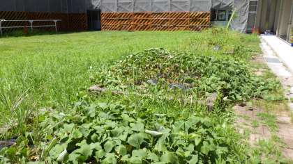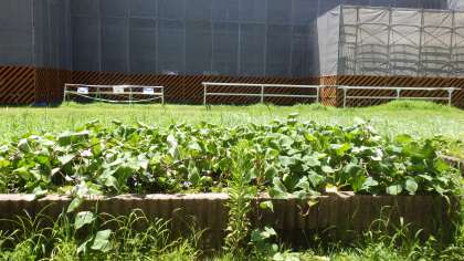 学校で花壇で育てているサツマイモの成長の様子です。日光をたくさんあびて元気にぐんぐんのびています。花壇からはみ出してしまうぐらいの勢いです。夏休み中は、担任が水やりを行っています。九月をお楽しみに。