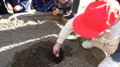 生活科「はなとなかよし」の学習で、アサガオを育ててきた植木鉢に、今度h球根を植えました。春に何色のチューリップが咲くのか楽しみです。アサガオを育てた経験を活かして大切に育てていきたいです。