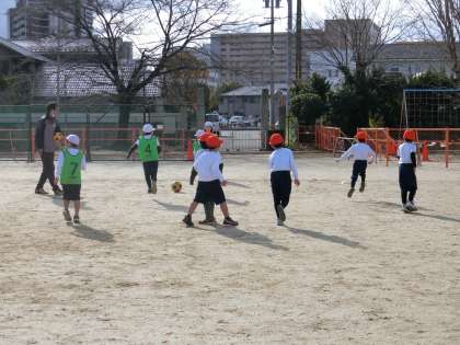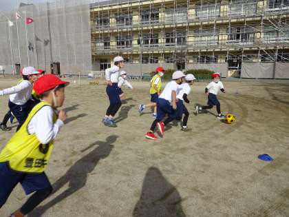 グランパスのコーチに来ていただき、サッカーを教えてもらいました。とても風が強く寒い中でしたが、全力で体を動かし、子どもたちは笑顔いっぱいで楽しみました。素敵なコーチに来ていただき、良い思い出ができました。
