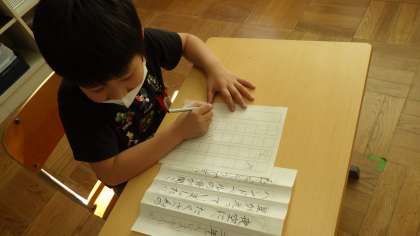 硬筆では、お手本をよく見ながら、難しい漢字も間違えないように丁寧に書き写しました。毛筆では、筆の入りや止め、はね、はらいに気をつけて書くことができました。