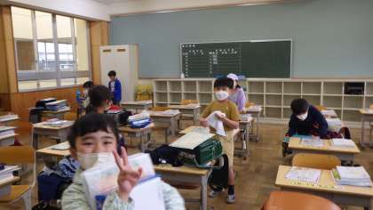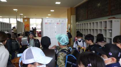 2年生に進級した子どもたちは、小学生になって初めてのクラスがえです。1年生の時は4学級でしたが、2年生は3学級になりました。ひと学級の人数も30人に増えて、また、楽しい学校生活の始まりです。名簿で自分の名前を確かめ新しい教室へ向かいました。