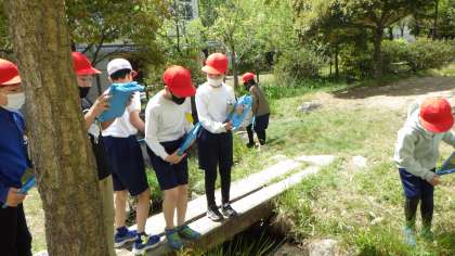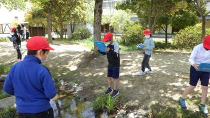 理科の授業の一環としてビオトープで春の生き物の観察を行いました。メダカやモンシロチョウなどを見つけ、タブレットに記録しました。全員が自然との触れ合いを楽しんでいました。
