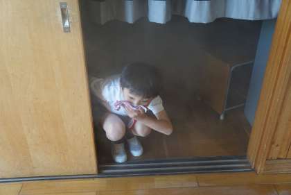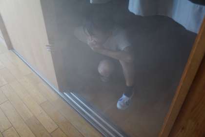 疑似的な煙の中を歩く煙道訓練を行いました。火事になった時に、煙を吸う危険性や煙をできるだけ吸わないように避難する方法を学びました。実際に、視界が悪い煙の中を歩く貴重な体験になりました。