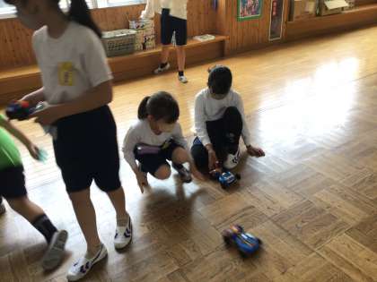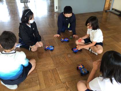 電池のはたらきについて学びました。学んだことを活かしてモーターカーを作りました。工夫を凝らして、プロペラカーを作ったり、競争をして遊んだりしました。ご家庭に持ち帰った際は、さらに速く動かす方法など考えて、一緒に遊んでみて下さい。
