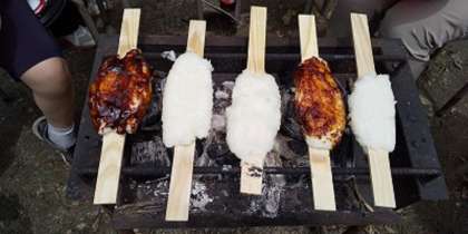 つぶしたご飯を串につけて、炭火で焼いていくと香ばしいにおいがしました。