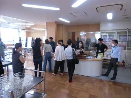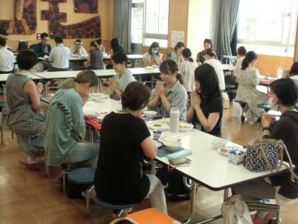 また、運営委員会終了後には、給食試食会が行われました。PTA役員、運営員の方、約30名が参加されました。今日のメニューは、スライスパン、大麦と野菜のスープ、ハンバーグ、チーズサラダ、メープルジャム、牛乳でした。配膳から盛り上がり、久しぶりの給食を楽しんでいる様子でした。