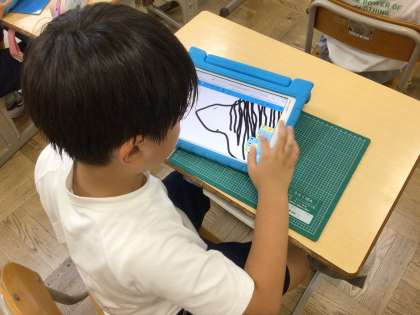 実際の写真を見ながら、タブレットで海の生き物を描く練習をしました。