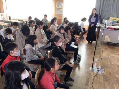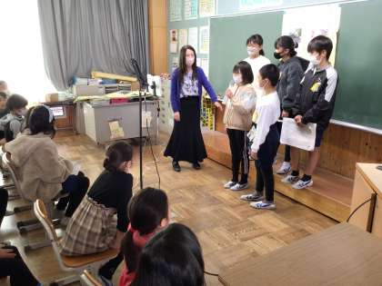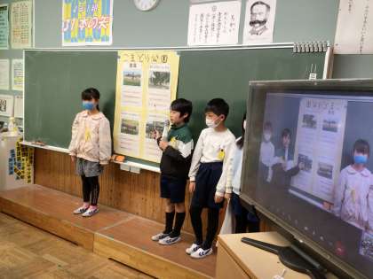 敷島小学校の友達と2回目のオンライン交流会がありました。1、2組の児童が挙母地区のおすすめスポットを調べ、ポスター発表をしました。敷島の友達もたくさん質問や感想を発表してくれました。楽しい交流を通して両校のきずなを深めることができました。