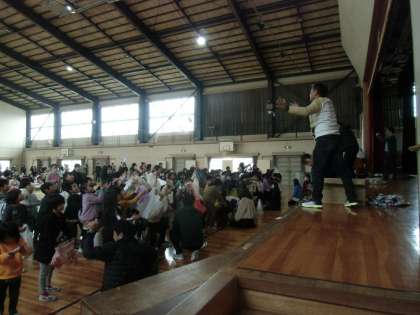 第1部では、ペットボトルボーリング、KOROMO BINGO、ギャラクシーボトル、スーパーボール、ふわふわスライム、ストロー鉄砲と、たくさんの講座が開かれ、自分が選んだ講座で遊びや作品づくりを楽しんでいました。第2部では、参加者全員が体育館に集まり、クイズ大会やお菓子まきで大いに盛り上がりました。