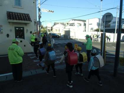 運動初日の1日、多くの自治区や交推協の方が、立哨指導をしていただきました。写真は、朝の登校の様子(栄町・平芝地区)です。寒い中、早朝からの指導、ありがとうございました。