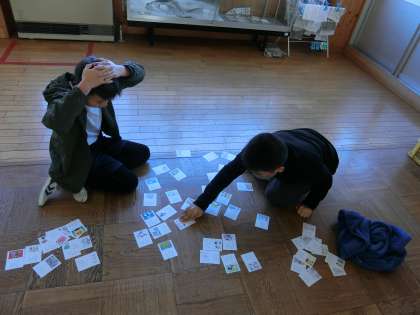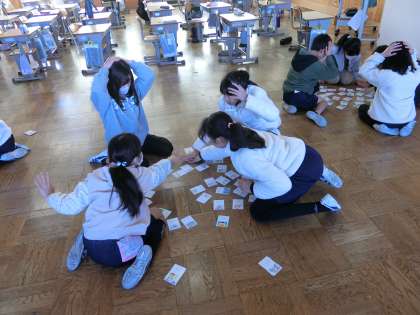書き初め大会も終わり、5年生ではクラス対抗かるた大会を開催しました。普段からかるたを休み時間にやっている子もおり、白熱した戦いとなりました。結果は11対7で2組の勝利でした。個人では50枚中39枚取った子もおり、みんなで楽しくかるたをすることができました。