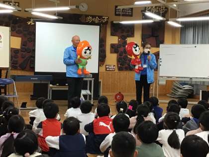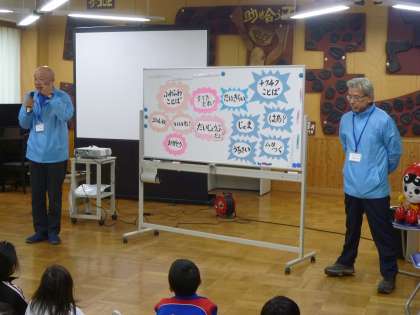 講師を招いて人権移動教室を行い、人権について学びました。1年生にとって「人権」という言葉は難しいですが、アニメなどを見せてもらいながら、1年生にも分かりやすく説明していただきました。