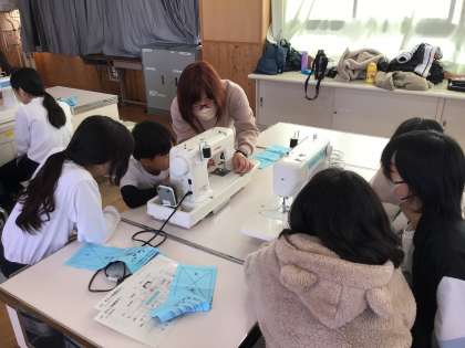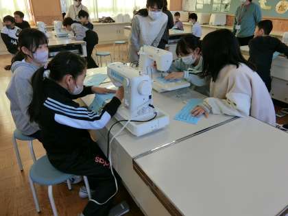 家庭科の授業で初めてミシンを使いました。上玉利先生の説明を真剣に聞き、実際にミシンに触れながら学習を進めていきました。上糸と下糸が重なった時には思わず声をあげている子もおり、どの子も集中して取り組んでいました。また、多くのボランティアの方のアドバイスもあり、安全かつスムーズに活動することができました。ありがとうございました。