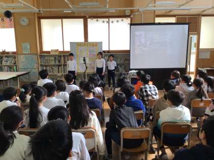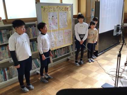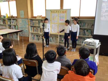 敷島小学校と3回目の交流会を行いました。今回は、4年3組が自分たちの生活について調べたことを発表しました。調査結果を自作の図や表を用いてとても分かりやすく報告することができました。敷島小の友達もたくさん質問や感想を発表してくれました。