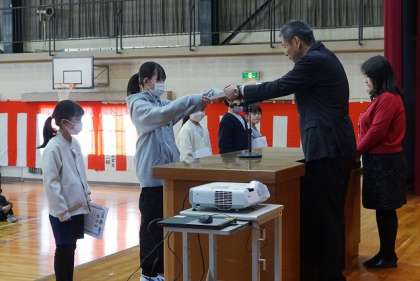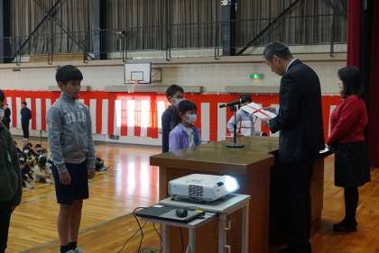 表彰伝達では、学年ごとによい行いをした児童に「挙母賞」の表彰を行いました。また、書き初め大会や絵画コンクール等で優秀な成績だった児童に、賞状を手渡しました。