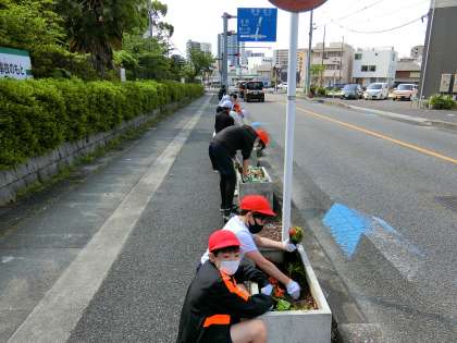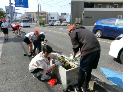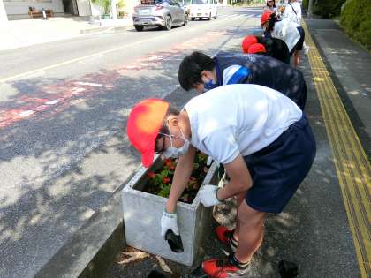 学校の正門を出てすぐにある歩道の花壇を植え替えました。虫に四苦八苦しながらも丁寧に任されたことを最後までやることができました。ぜひ子どもたちが植え替えた花壇をご覧ください。