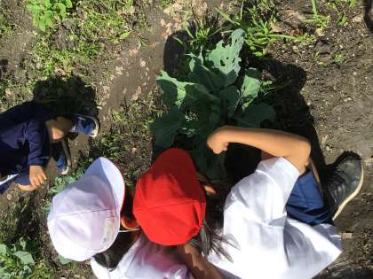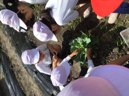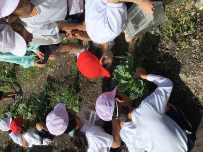 学年のキャベツの畑にモンシロチョウの幼虫がいました。先日クラスごとに実際に近くで観察しに行きました。現在その時の幼虫は蝶となっています。