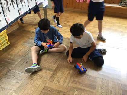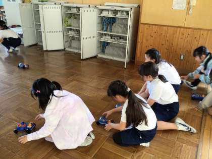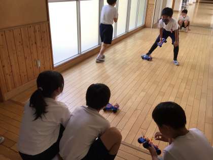理科では、電池のはたらきを学習しました。その学習を生かして、各クラスでモーターカーを作りました。休み時間には、他のクラスの子と競争をしたり、もっと速く走るように工夫をしながら楽しんで遊んでいました。