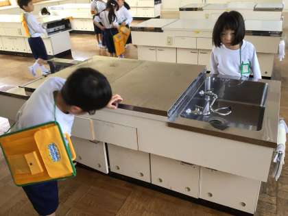 5月上旬、1年生が学校探検をしました。音楽室や家庭科室などの特別教室で見つけたものや、校長室や保健室などで出会った先生の絵を描きました。自分の教室には無いものをたくさん見つけながら、どの子も興味津々で探検できました。