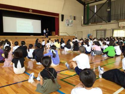 5月下旬、1年生を迎える会がありました。5・6年生が1年生のために、学校に関するゲームを準備してくれていました。お祝いのメッセージカードをサプライズで受け取り、にこにこ笑顔の1年生でした。