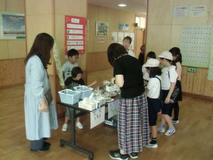 実際にお金を使った学習のため、お客さんは先生方限定でしたが、いろいろな学年の子が「いいなあ」、「私も買いたい」と言いながら集まってきて、お店は大繁盛でした。お店屋さんのにじ組の子も、お客さんの先生方も、見ていたいろいろな学年の子も笑顔になる素敵な「やさいスーパー」でした。