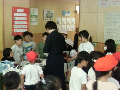 にじ組の児童が、会議室前で「やさいスーパー」を開店して、生活単元で育てた野菜を販売してくれました。「いらっしゃいませ」という元気な声が響き、値段を確認してお金を受け取ったり、おつりを出したりしていました。商品を袋に入れ、「ありがとうございました」としっかり言うこともできていました。