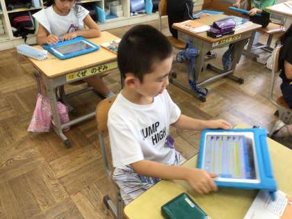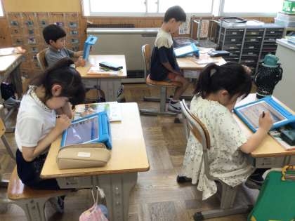 図画工作科「わっかのへんしん」の鑑賞の学習で、タブレットを使って行いました。グループワーク機能で学級の友達の作品を表示して共有を行いました。友達の作品の写真をゆっくり見て感想を入力することができました。最後は提出も行いました。