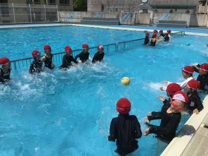 6月4日、プール開きをしました。プールに入る際の注意事項などを確認した後、ボールやビート板に水をかけあって動かす水掛けバトルをしました。最後には、これからお世話になるプールに一礼し、切り替えのできる引き締まった姿を見ることができました。