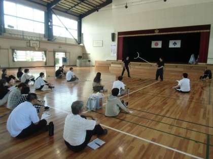 1つめは、豊田警察署生活安全課の方を講師に迎えた「不審者対応避難訓練」です。昨年度は、不審者が学校に侵入した時に、いかに安全に体育館等に児童を避難させるかの訓練を行いましたが、今年度は、刃物をもった不審者が校内に侵入した際、いかに子どもを被害から守るかについて学びました。訓練後には、さすまたの有効な使い方や不審者と遭遇した時の初期対応、対応する教員間で大きな声を出して情報把握することの大切さなどを、警察の方から具体的に教えていただきました。