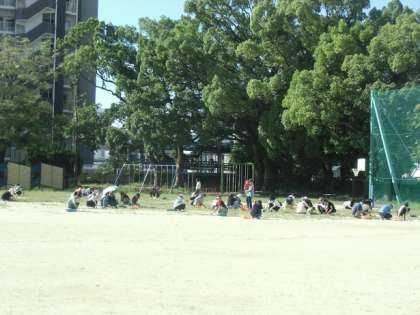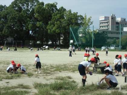 予想以上に暑い中でしたが、子どもたちが思う存分、運動会の練習に取り組めるようにと、ご協力いただいた保護者の皆さんに感謝しています。保護者の方と一緒の作業だったので、子どもたちも張り切ってたくさんの草を取っていました。