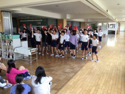 運動会がだんだんと近づいてきました。今年は赤白分かれて応援を行います。それぞれのクラスで応援団プロジェクトメンバーを中心に応援を考えて練習を行いました。今日は1組2組でお互いに披露しあいました。お互いのを見たことで気合いが入った様子でした。明日から、下級生に教えに行きます。がんばりましょう!!