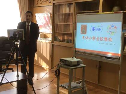 12月23日(月)の1校時、冬休み前全校集会を行いました。インフルエンザが流行していることもあり、今回はオンラインでの集会としました。