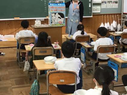 「食事のマナー」、「給食は誰が作っているのかな」、「なぜ給食を食べないことはもったいないのだろう」の3つの学習をしました。担任の話や栄養教諭の長友先生からの話を聞き、「これからは赤•黄•緑の栄養を考えて、苦手なものも3口多く食べるよ」や、「机に肘をつかずに食器を持って食べるよ」等、食事に対する個々の目標を立てました。