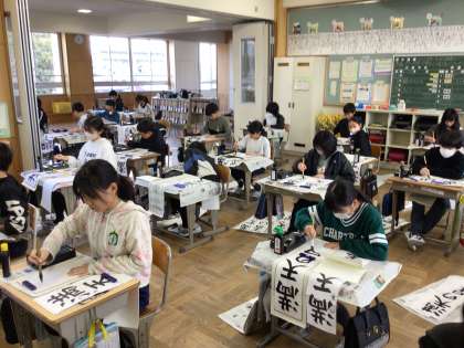 冬休み明け最初の登校日に毎年恒例の書き初め大会が行われました。大会に向けて、冬休みにも練習を頑張った子も多く、全員が気合いの入った字を書いていました。書き初めの展示もあります。ぜひご覧になってください。