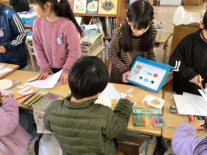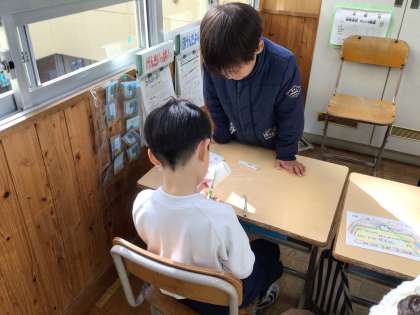 2時間目に1年生を招いておもちゃ祭りを行いました。グループごとにどんなおもちゃを作ろうか考えて準備や練習を重ねてきました。1年生が喜んでくれるように実物をみせたり、タブレットのタイマー機能を使って遊んだりしました。1年生が「説明が分かりやすかった」と言ってくれて喜んでいました。お礼の手紙をもらって大切に読んでいました。