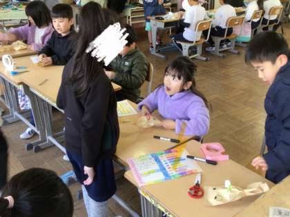 2年生主催のおもちゃまつりに招待され、参加しました。楽しく遊べるおもちゃを、1年生が手際よく作れるように用意していてくれました。「すごく楽しかったな」や、「2年生の生活科が楽しみだな」との声が聞こえてきました。2年生へ、お礼のお手紙を書いて届けました。