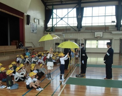 4月14日(月)の2校時、1年生が「交通安全教室」を実施しました。新しく入学してきた子どもたちが、安全に登下校したり、交通ルールを守って生活したりすることができるように、交通指導員の方から、安全な横断歩道の渡り方などを学びました。また、雨の降る季節を前に、傘を持っている時に特に注意すること等についても確認しました。