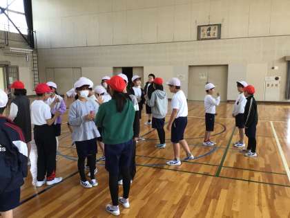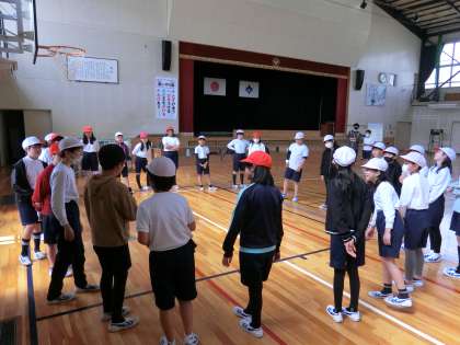 声を出さずにジェスチャーで誕生日順に並ぶ「バースデーチェーン」と頭と体を使って行う「言うこと一緒、やること反対ゲーム」のレクリエーションを学年で行いました。