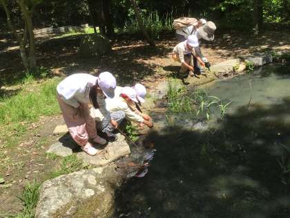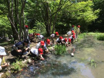 赤白どちらのチームも池の中の生き物に夢中でした。池に手を入れて生き物を捕まえて大喜びする子や恐る恐る覗き込む子など、それぞれの森を満喫しました。