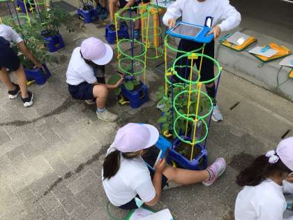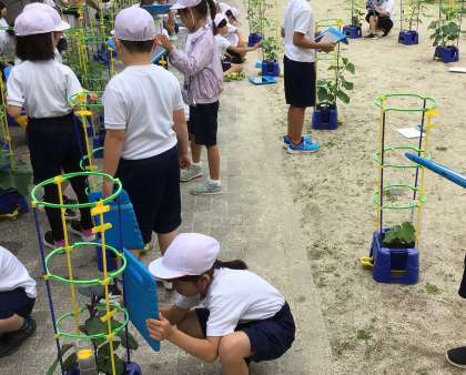 植木鉢で育てている野菜が大きくなりました。種類によっては、葉が子どもたちの手よりも大きくなり、生長におどろいていました。実がなり始めたことに喜びを感じながら、毎日の世話を頑張っています。収穫が楽しみですね。