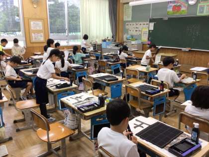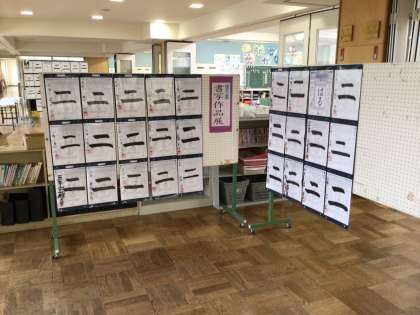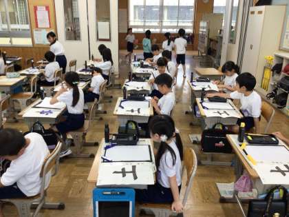 今年度より始まった書写学習もすでに6回目をむかえました。筆や硯などの学習用具の取り扱いにも、子供たちは慣れ始めたようです。この日は漢字の「土」の文字を練習しました。書いた作品は教室前のワークスペースに展示していますので、来校された際には、ぜひご覧になってください。