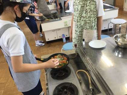 家庭科の学習で「いろどりいため」の調理実習を行いました。にんじん、ピーマン、たまねぎ、ハムをそれぞれ分担して切り、協力して炒める調理を行いました。同じ大きさに切り分けるところに苦戦しながらも、美味しく出来上がりたくさんの笑顔が見られました。