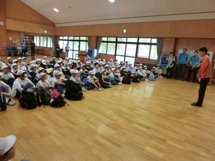 楽しみにしていた教育キャンプに出発です。「自立」「協力」「感謝」を意識して2日間頑張りたいと代表の子が話しました。
