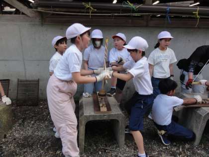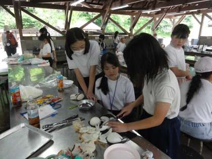 オリエンテーリングの次の活動は野外炊事です。火起こしに苦労しながらも、班で力を合わせて頑張りました。もぐさ実行委員がヨモギから作ったもぐさのおかげで火をつけることができました。所員さんにも立派なもぐさだと感心していました。