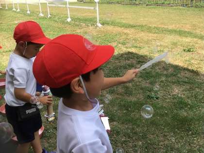 シャボン玉遊びをしました。うちわを使うとたくさんのシャボン玉ができて、大喜びです。ストローを使って大きいシャボン玉作りに挑戦するなど、思い思いのシャボン玉遊びをしました。
