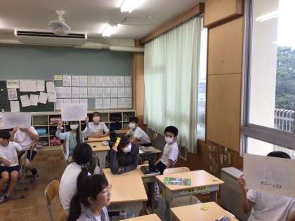 「かぶらナイス!」という活動を行いました。出されたテーマに合うものをグループで話し合い、他のグループと被らないようにするゲーム感覚の活動です。話し合いの中で、理由を言う、友だちの意見を理解する、譲る、説得するなどといった話し合いのスキルを自然と使うことができ、楽しみながら活動することができていました。
