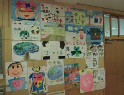 夏休みの自由作品応募として、「思いやり算」を表す絵画コンクールを実施しました。19名の児童がすてきな絵を描いて提出してくれました。どの作品もやさしい気持ちが込められていたので、他の児童や来校者にも見てもらえるように、会議室前に掲示をしました。ご来校された際は、ぜひご覧ください。