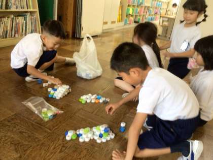 ペットボトルのキャップを使って、いろいろな形に積んでみたよ。